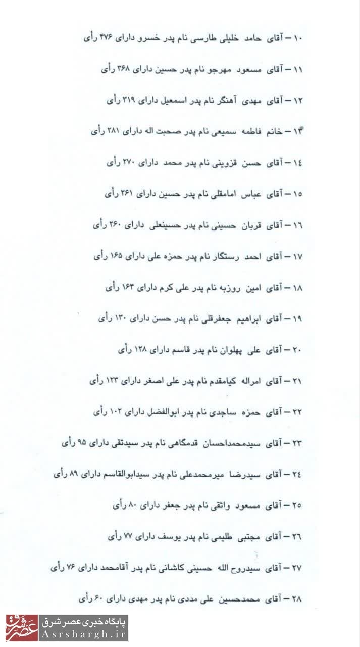همچنین رسولینژاد ۱۵ هزار و ۵۷۸ رأی، مشهدیعباسی ۳ هزار و ۳۱۵ رأی، موسوی ۲ هزار و ۲۰۹، باقری ۲ هزار و ۹۷ رأی و یوزباشی یک هزار و ۷۰۱ رأی را کسب کردند