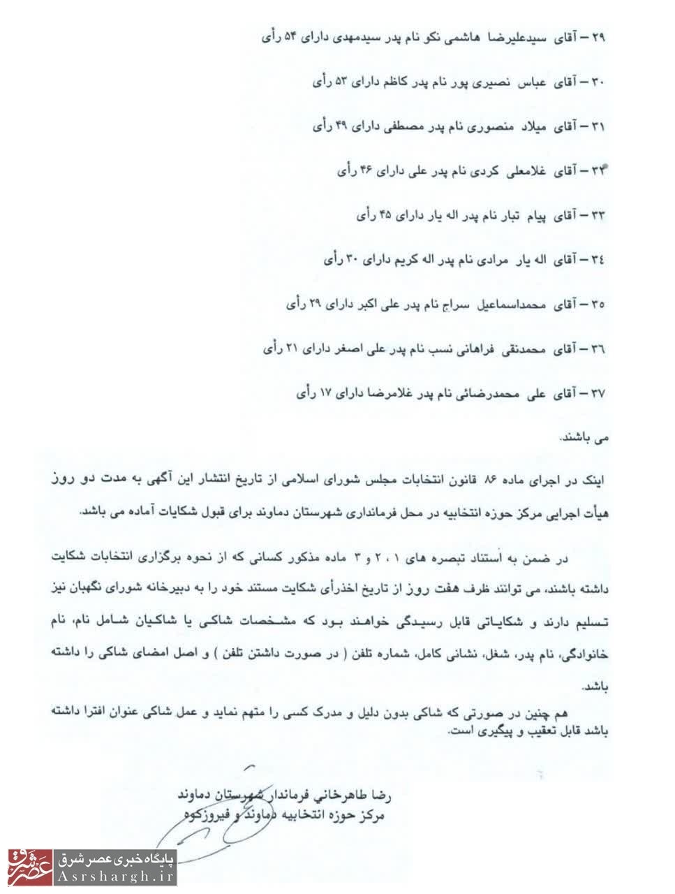 جمع آرای مأخوذه در حوزه انتخابیه دماوند و فیروزکوه ۵۴ هزار و ۲۹۱ رأی بوده است.