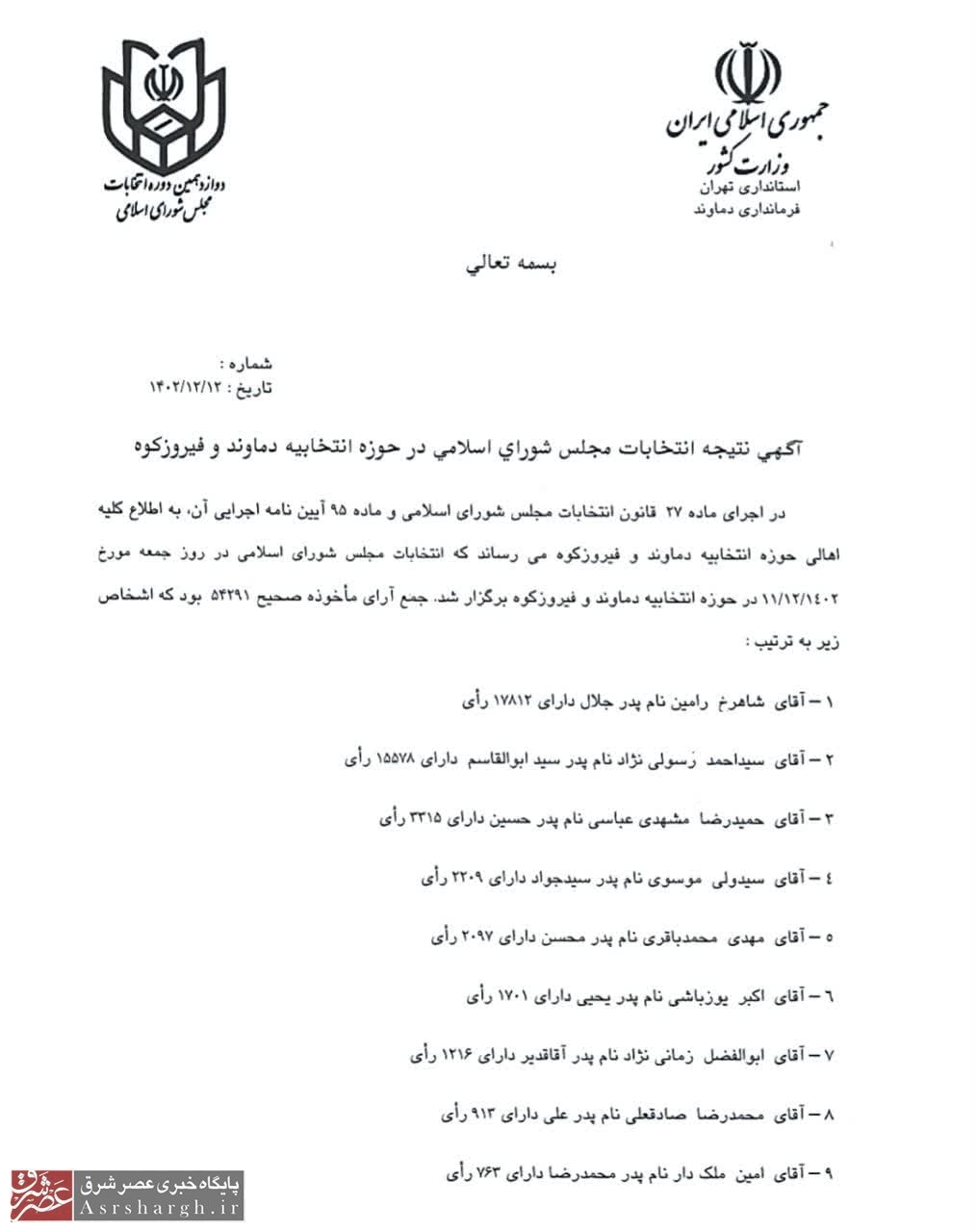 به گزارش پایگاه خبری عصر شرق، در اجرای ماده ۲۷ قانون انتخابات مجلس شورای اسلامی و ماده ۹۵ آیین نامه اجرایی آن به اطلاع کلیه اهالی حوزه انتخابیه دماوند و فیروزکوه میرساند که انتخابات مجلس شورای اسلامی در روز جمعه مورخ ١١/١٢/١۴٠٢ در حوزه انتخابیه دماوند و فیروزکوه برگزار شد.