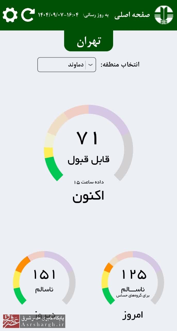 بر اساس دادههای سامانه پایش کیفیت هوا، شاخص لحظهای آلودگی در دماوند تا ساعت ۱۵ امروز به عدد ۷۱ رسیده که در وضعیت «قابل قبول» قرار دارد.