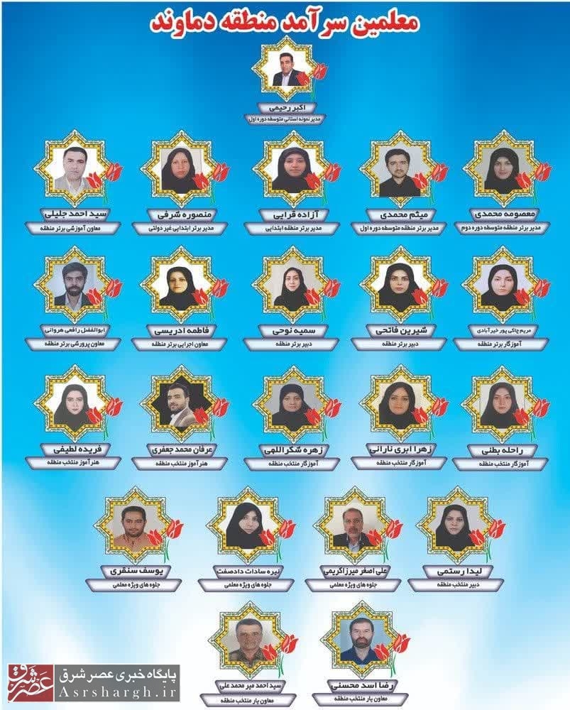 فرهنگیان فرزند شهید، مدیران مدارس مقاطع مختلف تحصیلی و معلمان سرآمد و نمونه استانی و منطقهای آموزش و پرورش دماوند در این آیین با حضور مسؤولان این شهرستان مورد تجلیل قرار گرفتند؛ همچنین در عمل ابتکاری، از یک زوج فرهنگی نیز تقدیر به عمل آمد.