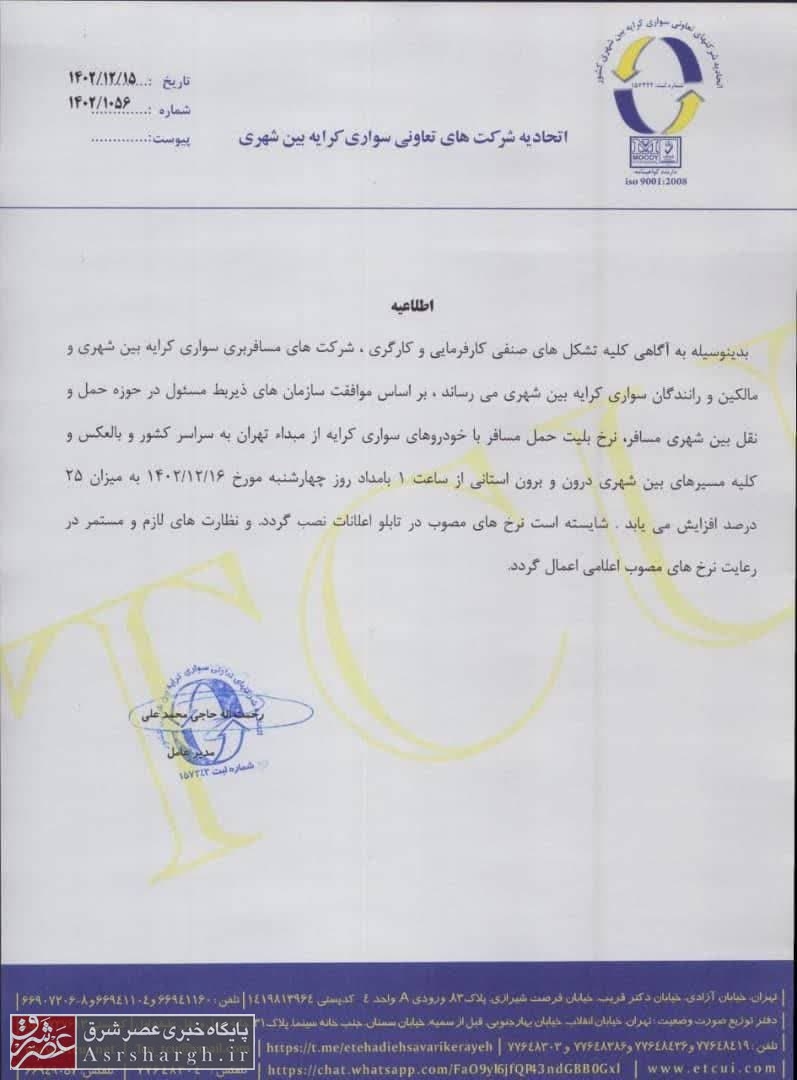 طبق افزایش ۲۵ درصدی نرخ کرایه حمل برون شهری برای میدل باس از ۲۰ هزار تومان به ۲۵ هزار تومان و تاکسی سواری از ۵۰ هزار تومان به ۶۰ هزار تومان افزایش پیدا خواهد شد.