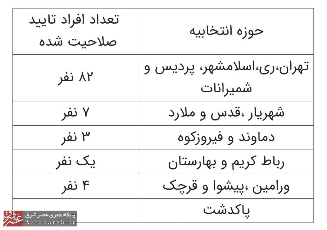 رییس ستاد انتخابات استان تهران تصریح کرد: حوزه انتخابیه تهران، ری، اسلامشهر، پردیس و شمیرانات با ۸۲ نفر تایید شده بیشترین آمار را در افراد تایید شده توسط شورای نگهبان دارد.