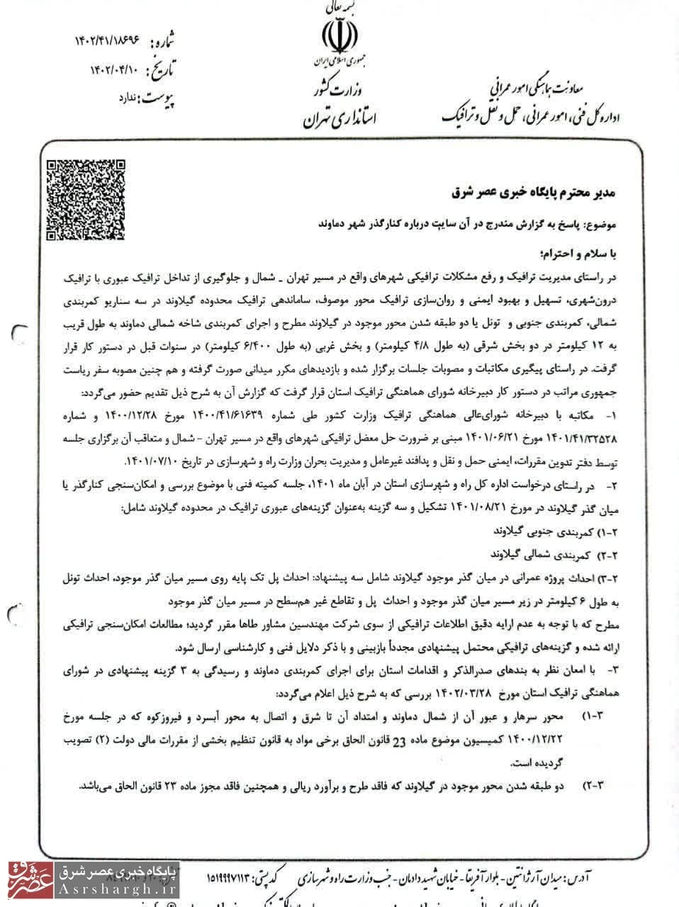 ۳- با امعان نظر به بندهای صدرالذکر و اقدامات استان برای اجرای کمربندی دماوند و رسیدگی به ۳ گزینه پیشنهادی در شورای هماهنگی ترافیک استان مورخ ۱۴۰۲/۰۳/۲۸ بررسی که به شرح ذیل اعلام میگردد: