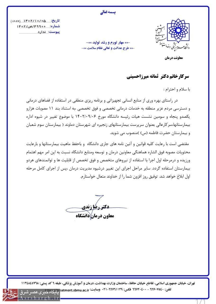 در حکم معاون درمان خطاب به میرزاحسینی آمده است: در راستای بهرهوری از منابع انسانی تجهیزاتی و برنامهریزی منطقی در استفاده از فضاهای درمانی و دسترسی مردم عزیز منطقه به خدمات درمانی تخصصی و فوق تخصصی به استناد بند ۱۱ مصوبات هزارو یکصدو پنجاه و سومین نشست هیات رئیسه دانشگاه مورخ ۰۶/۰۹/۱۴۰۲ با موضوع تغییر در شیوه اداره بیمارستانها، سرکار عالی بهعنوان سرپرست بیمارستانهای زنجیرهای شهرستان دماوند «بیمارستان سوم شعبان و بیمارستان حضرت فاطمه (س)» منصوب میشوید.