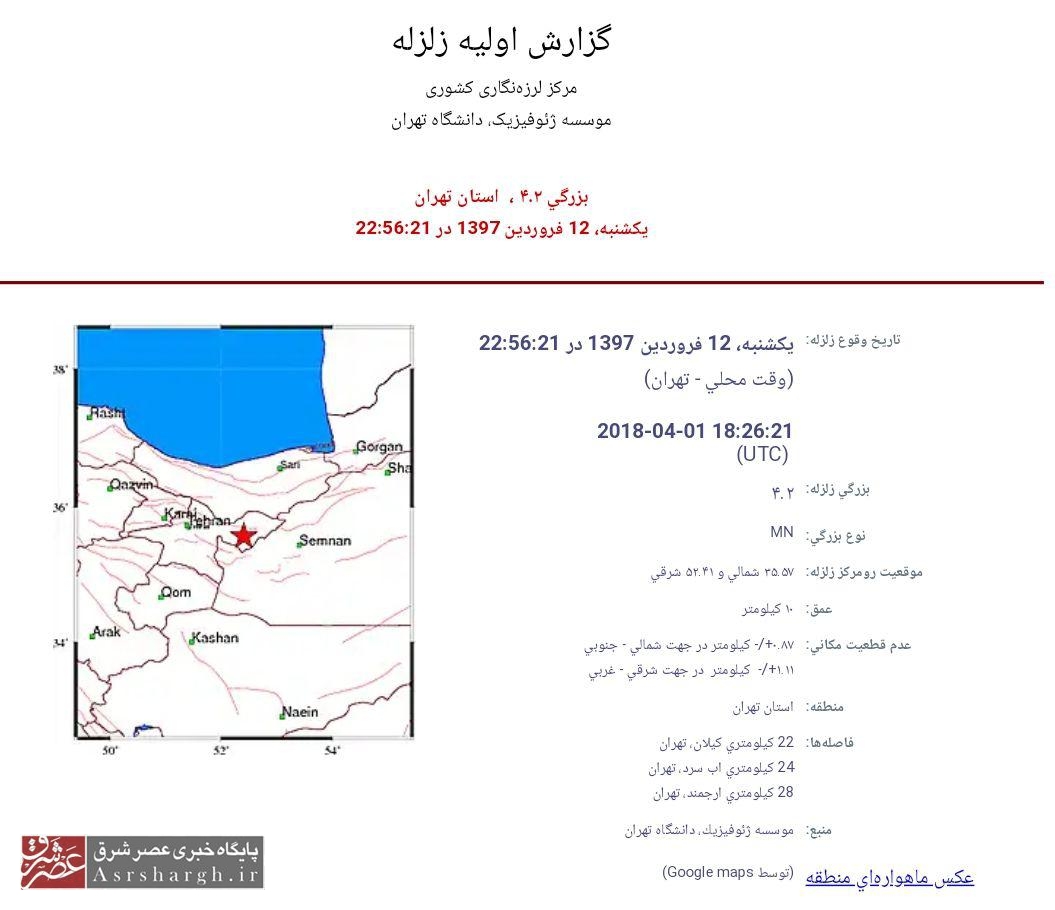 دقایقی پیش یک زلزله ۴.۲ ریشتری شهر کیلان واقع در شهرستان دماوند را لرزاند