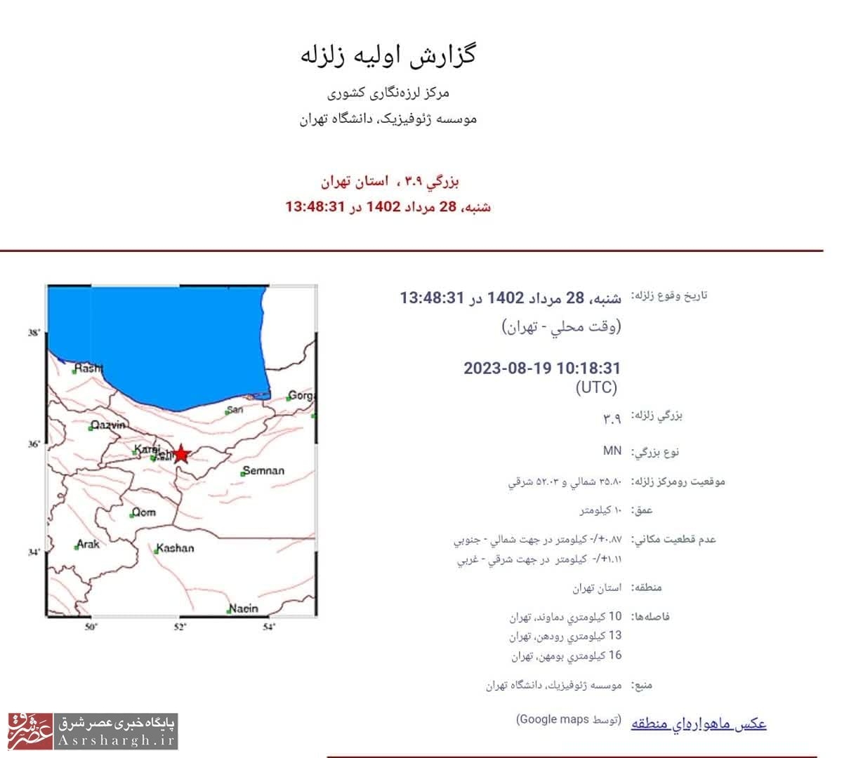 لازم به ذکر است، دقایقی پیش، زلزلهای به بزرگی ۳.۹ ریشتر در عمق ۱۰ کیلومتری زمین شهرستان دماوند و شهرهای همجوار را لرزاند.