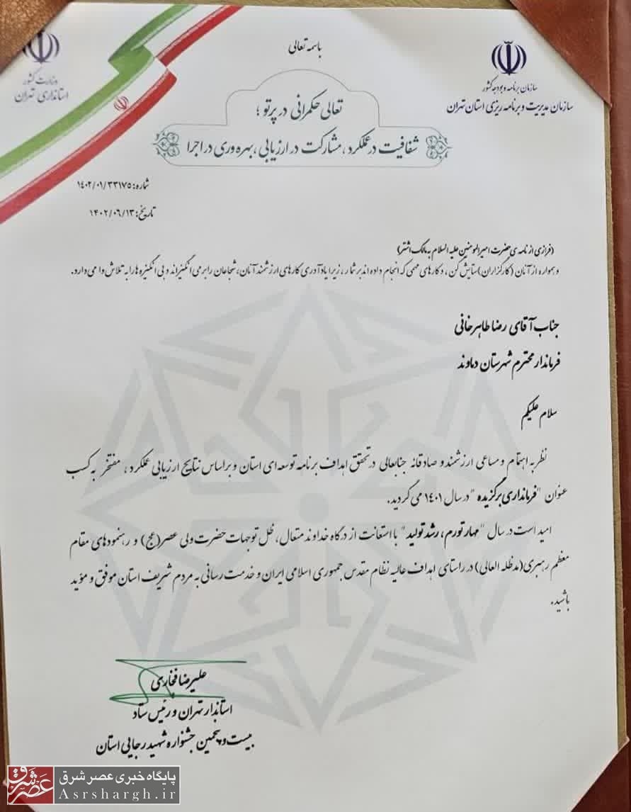 در بخشی از این لوح سپاس آمده: جناب آقای رضا طاهرخانی فرماندار محترم شهرستان دماوند، نظر به اهتمام و مساعی ارزشمند وصادقانه جنابعالی در تحقق اهداف برنامه توسعه استان و بر اساس نتایج ارزیابی عملکرد مفتخر به کسب عنوان “فرمانداری برگزیده” در سال ۱۴۰۱ می‌گردید.