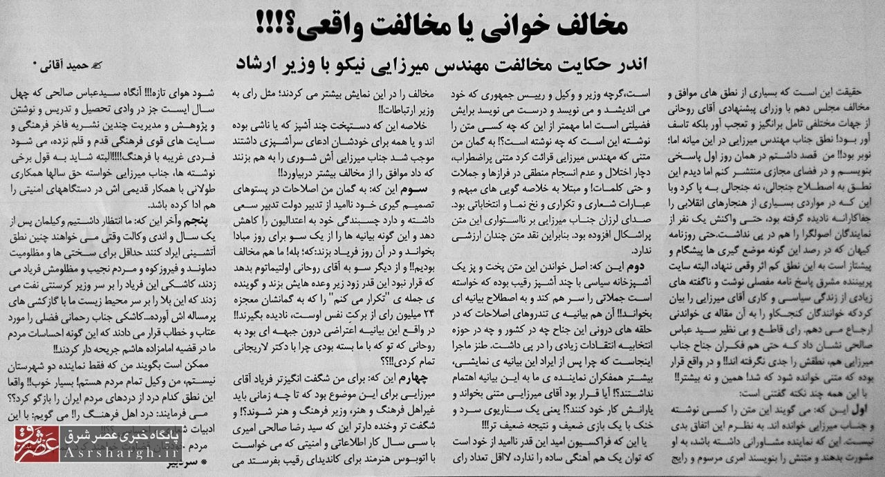 به گمان من متنی که مهندس میرزایینیکو قرائت کرد متنی پراضطراب، دچار اختلال و عدم انسجام منطقی در فرازها و جملات و حتی کلمات و مبتلا به خلاصه گویی های مبهم و عبارات شعاری و تکراری و نخ نما و انتخاباتی بود؛ صدای لرزان جناب میرزایی بر نااستواری این متن پراشکال افزوده بود؛ بنابراین نقد متن چندان ارزشی ندارد.