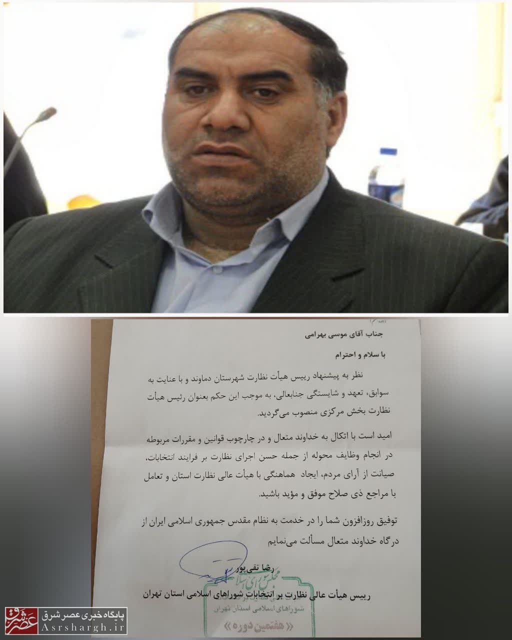 به گزارش پایگاه خبری عصر شرق، با صدور حکمی از سوی هیأت عالی نظارت بر انتخابات شوراهای اسلامی استان تهران، موسی بهرامی بهعنوان رئیس هیأت نظارت بخش مرکزی شهرستان دماوند منصوب شد.